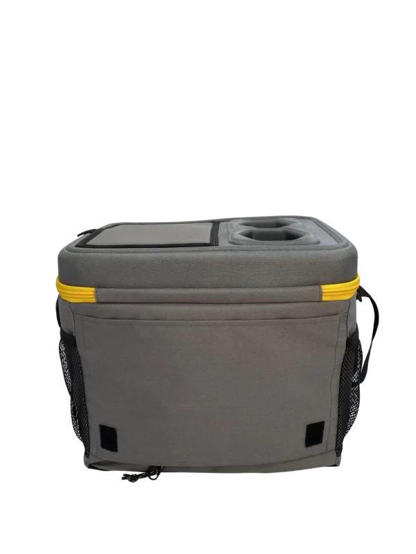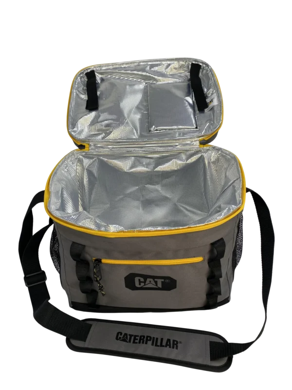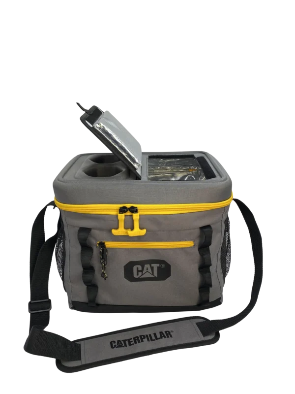 Glacière conservant les produits au frais. La glacière Caterpillar dispose d’une capacité de 24 canettes et est facilement transportable grâce à une courroie à l’épaule.